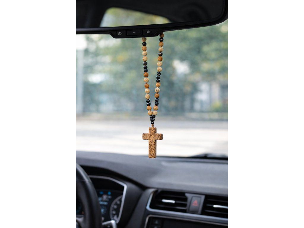Každý detail působí harmonicky a elegantně – od jemně strukturovaných korálků až po výrazný křížek, který symbolizuje ochranu, víru a klid na cestách. Díky své délce se amulet krásně zavěsí na zpětné zrcátko a stane se stylovým doplňkem interiéru vašeho auta.