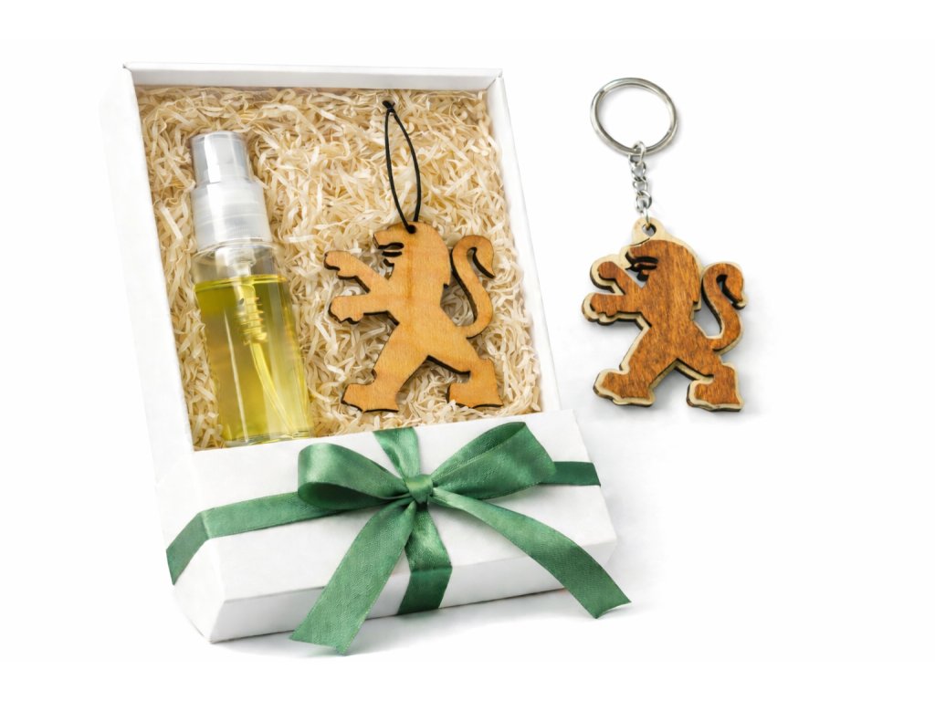 Součástí sady je kvalitní osvěžovač vzduchu s příjemnou a vyváženou vůní inspirovanou stylem značky Peugeot. Vůně je svěží, nevtíravá a ideální pro každodenní použití v interiéru vozu. Doplněním je dřevěný přívěsek na klíče s motivem ikonického lva Peugeot, precizně vyřezaný a doplněný kovovým kroužkem.