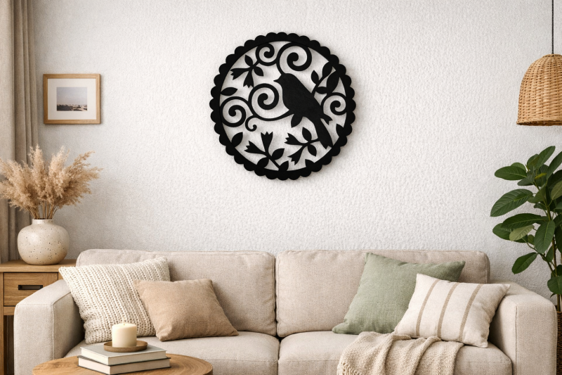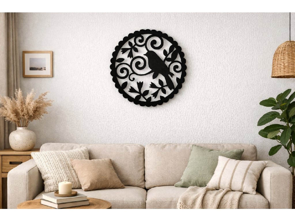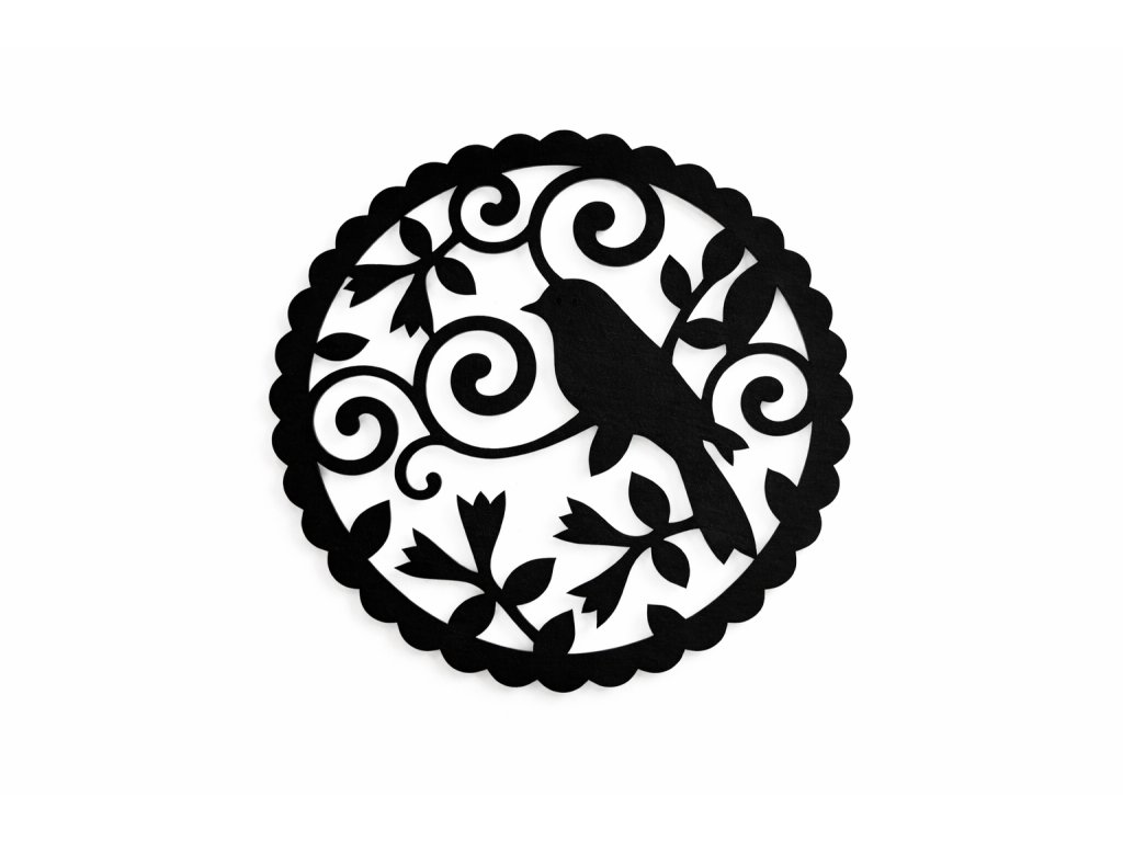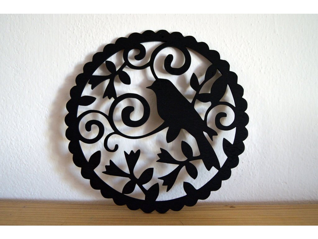 Kulatá dekorace Ptáček sedící na větvi v kulatém ohraničení. V nabídce v několika průměrech a barvách.