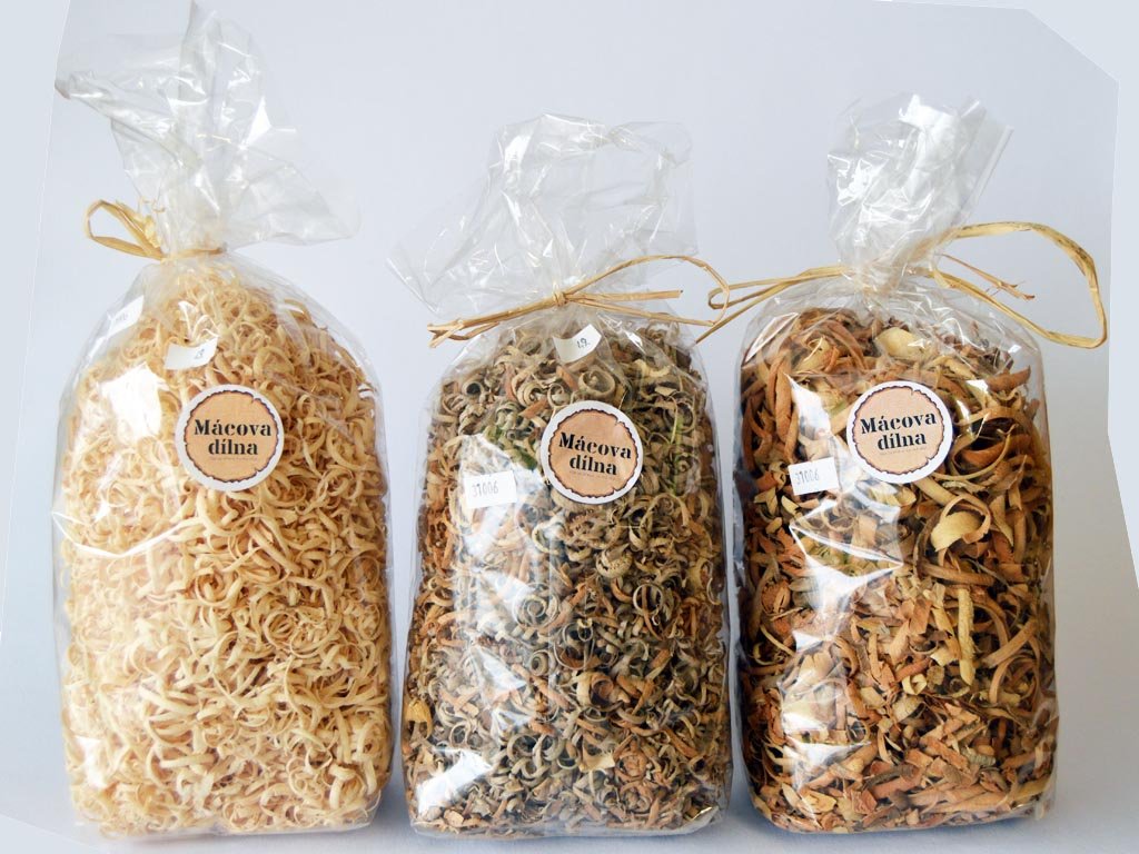 Dřevěné hobliny ze soustružení z různých dřevin. Na výběr z několika provedení - hrubé, jemné, tmavé, světlé viz fotografie. Baleno v celofánovém sáčku.
