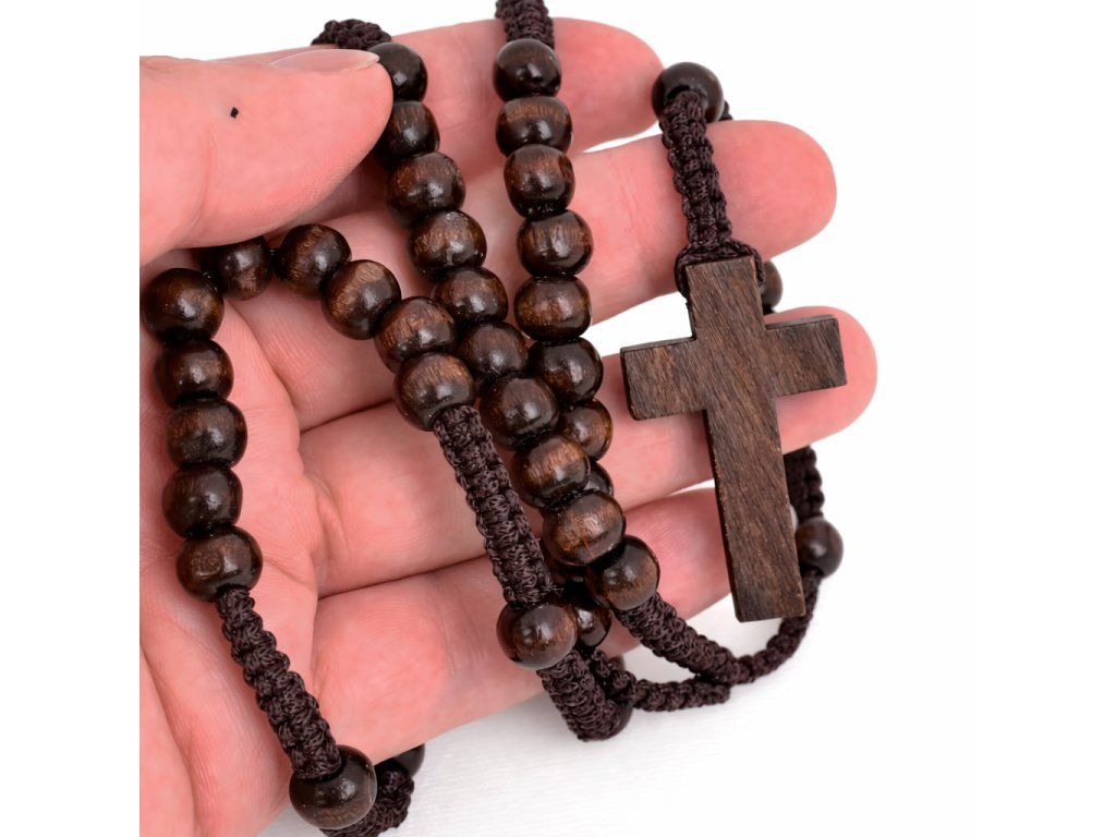 Dřevěný náhrdelník s křížkem – přírodní korálky, tmavý unisex styl