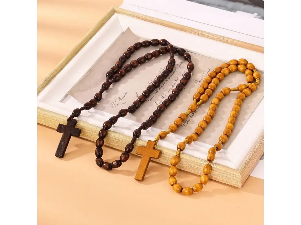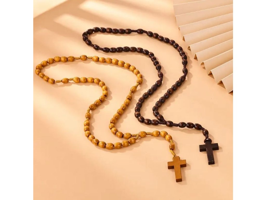 2. Teplo Světlého Dřeva a Příjemné Textury: Pro milovníky světlejších odstínů a originálních textur nabízíme růženec ze světlého dřeva. Oválné korálky mají přirozenou, jemně zdrsnělou strukturu, která dodává růženci jedinečný hmatový zážitek a rustikální šarm. Každý korálek nese známky přírodního dřeva, což zaručuje, že žádné dva růžence nejsou zcela identické. Tento styl je ideální pro ty, kdo hledají svěží, přirozený vzhled a chtějí cítit spojení s přírodou. Světlé dřevo a jeho jemné tóny přinášejí pocit lehkosti a čistoty.
