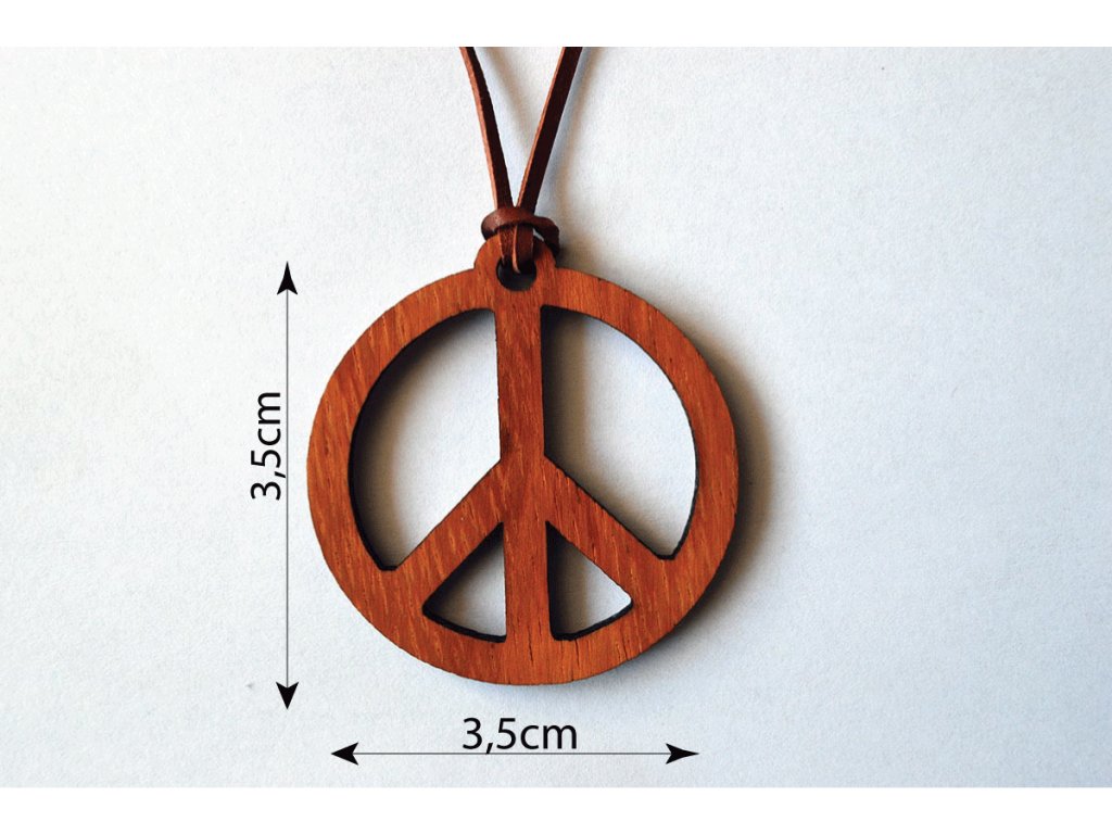 Dřevěný znak míru Hippies na krk vyrobený z exotického dřeva. Ošetřeno zdravotně nezávadným olejem. Provázek pravá kůže. Rozměr 3,5x3,5cm.