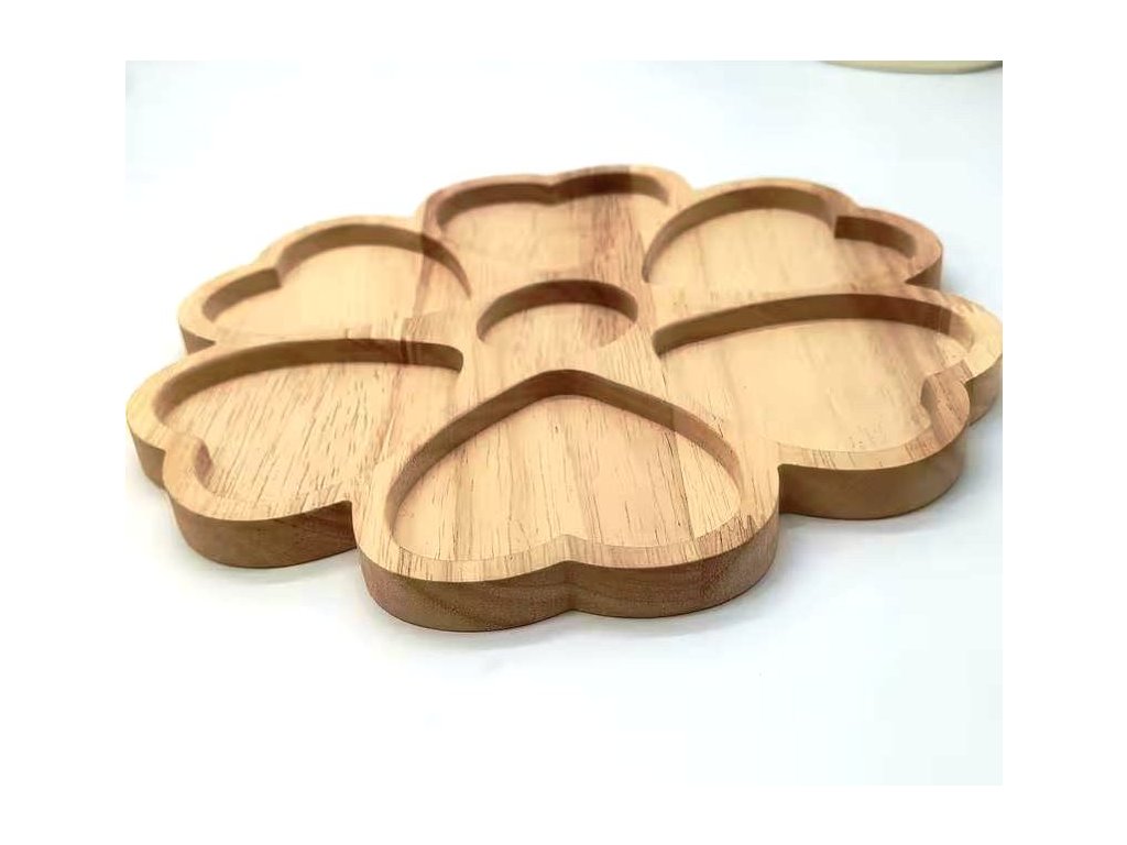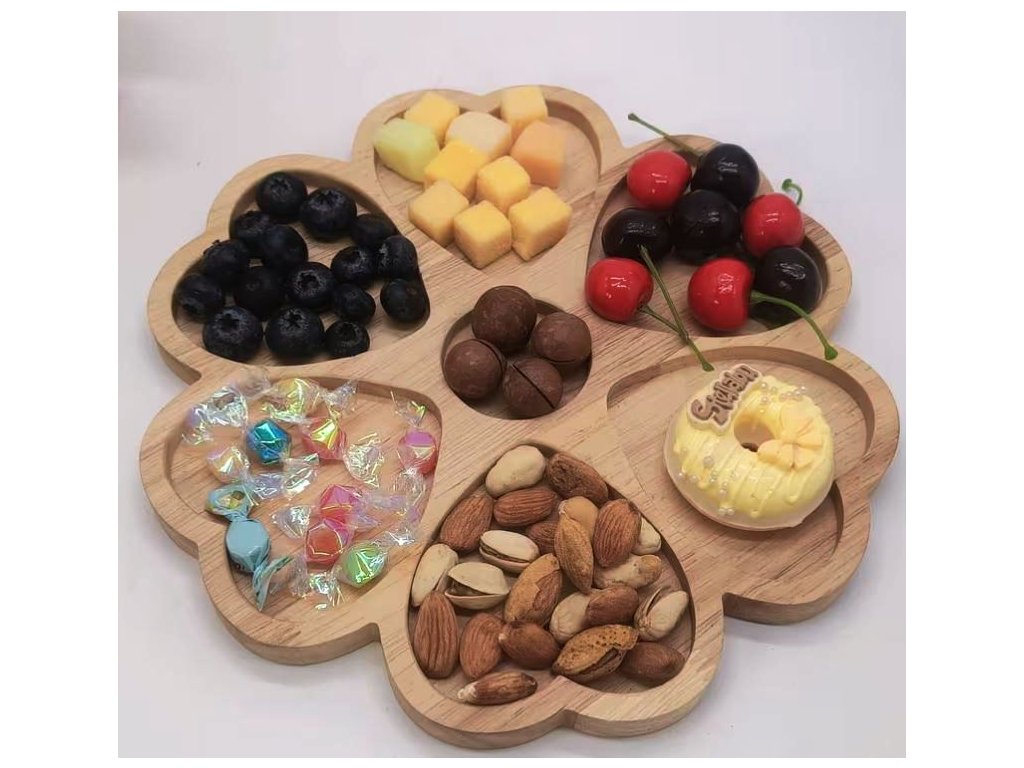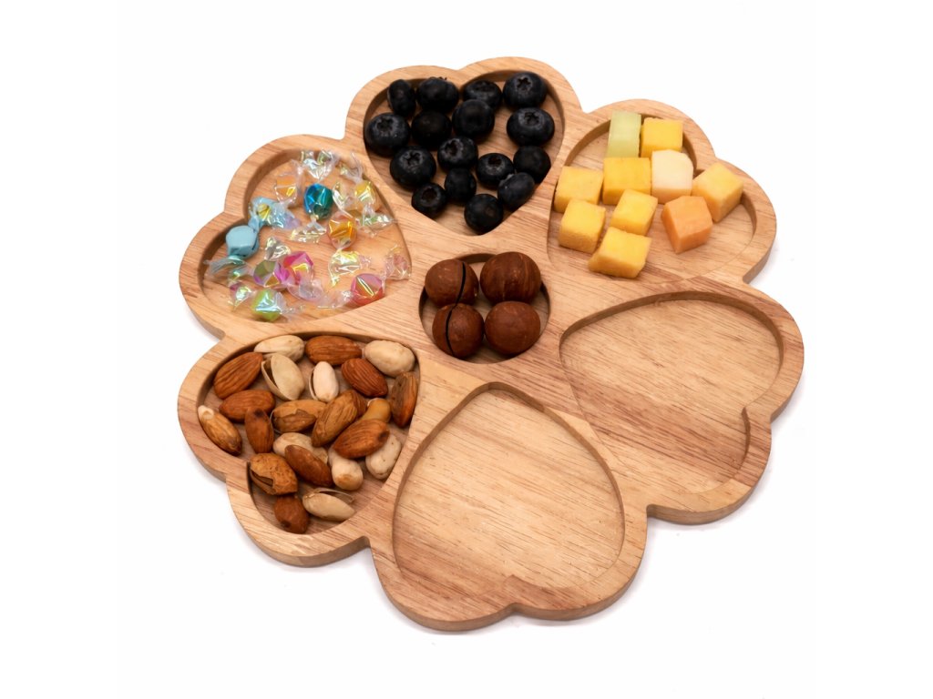 Tento elegantní dřevěný servírovací tác ve tvaru květu je nejen praktickým, ale i designovým doplňkem vaší domácnosti. Díky několika odděleným přihrádkám umožňuje přehledné servírování různých druhů pochutin – od ovoce a ořechů přes sladkosti až po drobné dezerty nebo sýry.