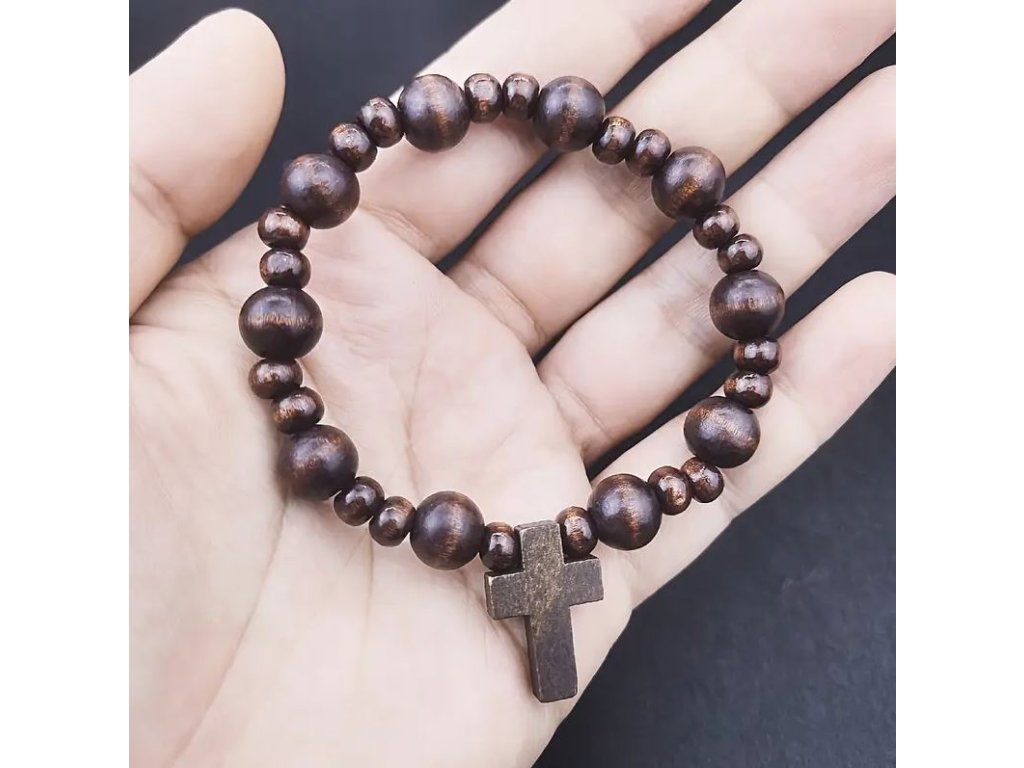 Náramek je pečlivě sestaven z hladkých dřevěných korálků navlečených na pružném lanku, díky kterému se pohodlně nosí a snadno přizpůsobí zápěstí o obvodu cca 19 cm. Dominantním prvkem je malý, ale výrazný přívěsek kříže, který dodává šperku hlubší rozměr.