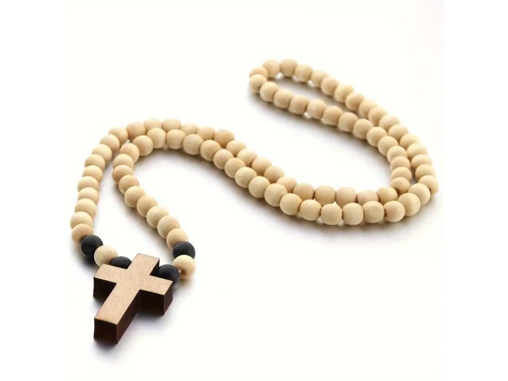 Elegantní Dřevěný Křížek: Křížek, rovněž vyrobený ze světlého dřeva s tmavšími hranami, krásně ladí s celkovým designem a podtrhuje jeho autenticitu. Je pevný a dobře tvarovaný, což symbolizuje sílu a víru.