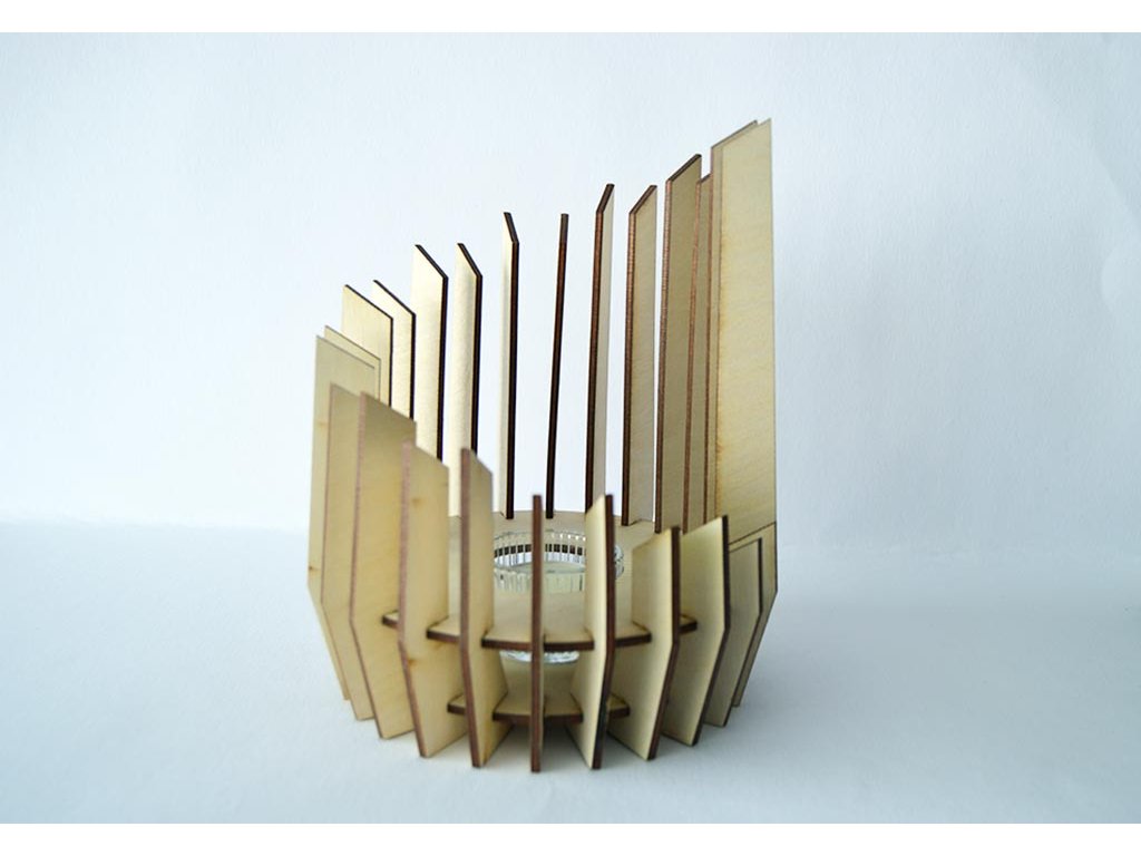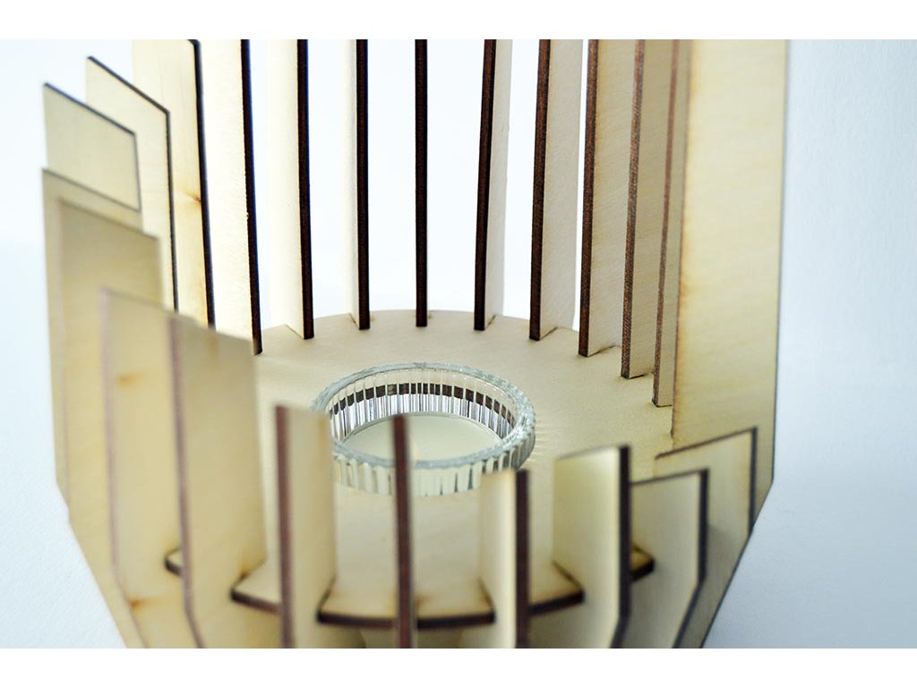 Dřevěný geometrický svícen vyrobený z překližované desky, která se poskládá do tohoto tvaru. Vše dostanete již zkompletované a svíčka se skleněnou nádobou je součástí.